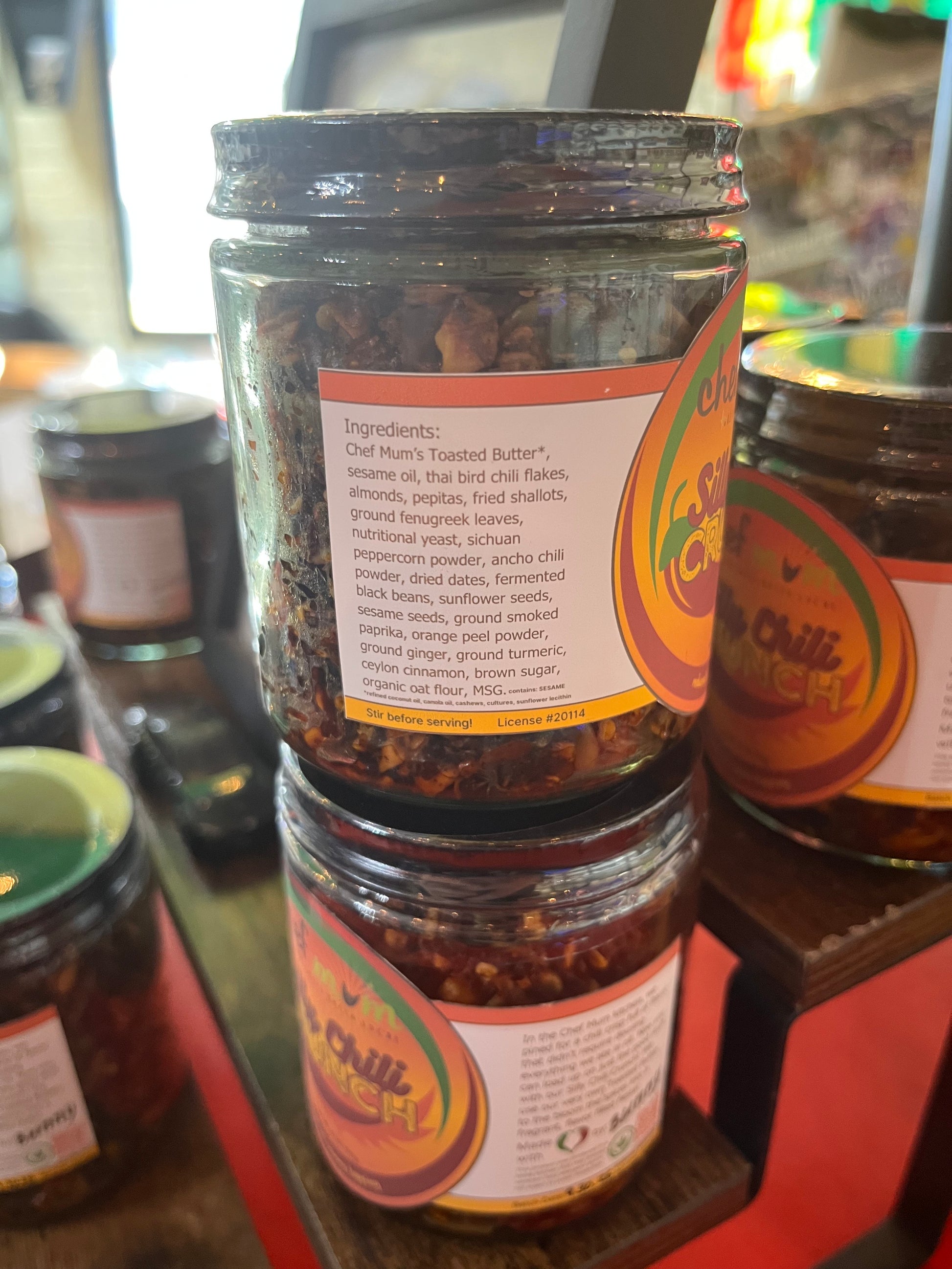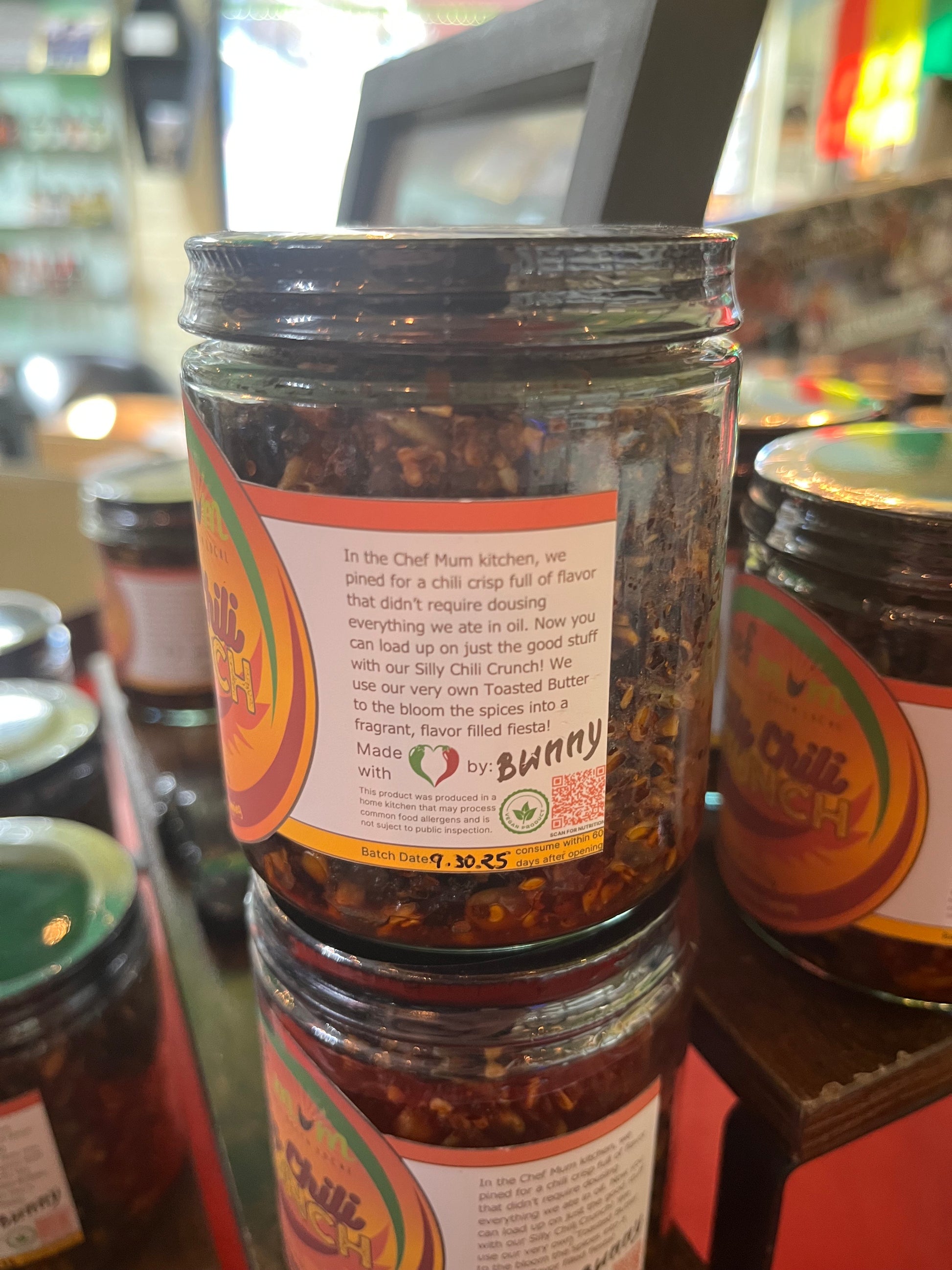From our friends at Phoenix based Chef Mum bakery, this amazing chili crisp substitutes all that excess oil for a condiment that is full of delicious and nutritious ingredients. This chili crisp is vegan, gluten free, local, and we are proud to be the first retail location to offer this product! Silly Chili Crunch is shelf stable up to 60 days from opening!